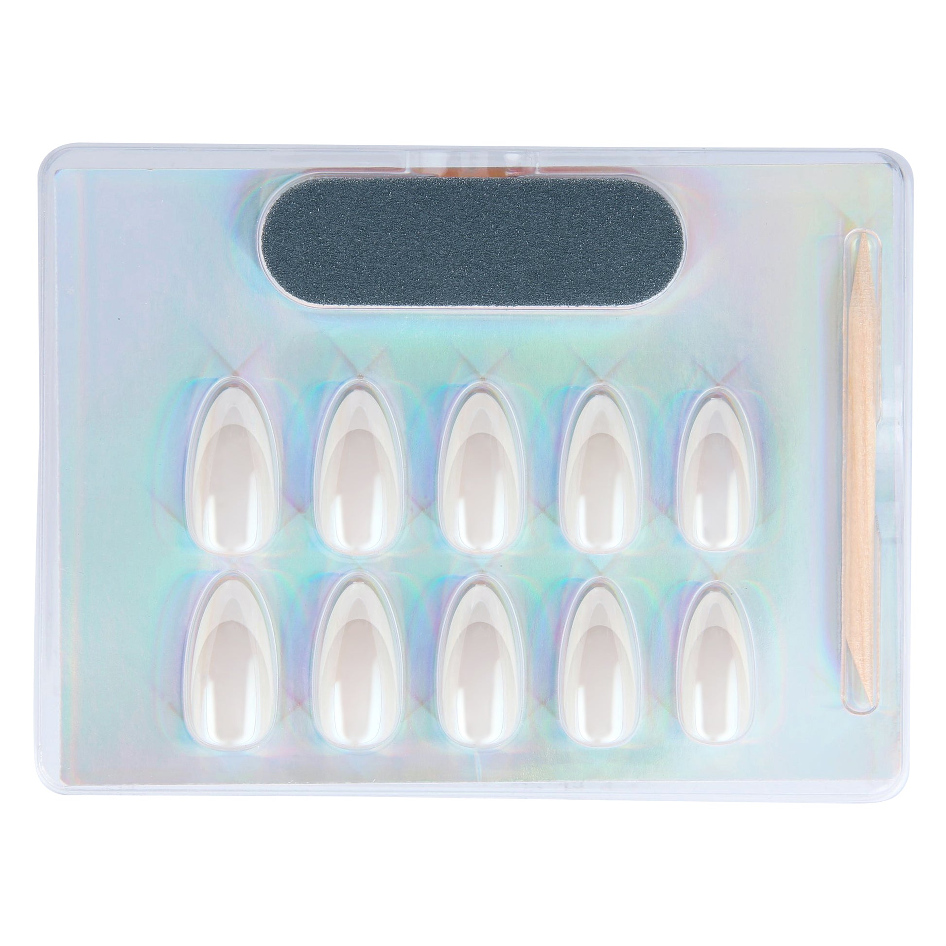 30 nails (15 sizes), sticky tabs, nail glue (2g), mini nail file, mini wood stick, 2 alcohol wipes